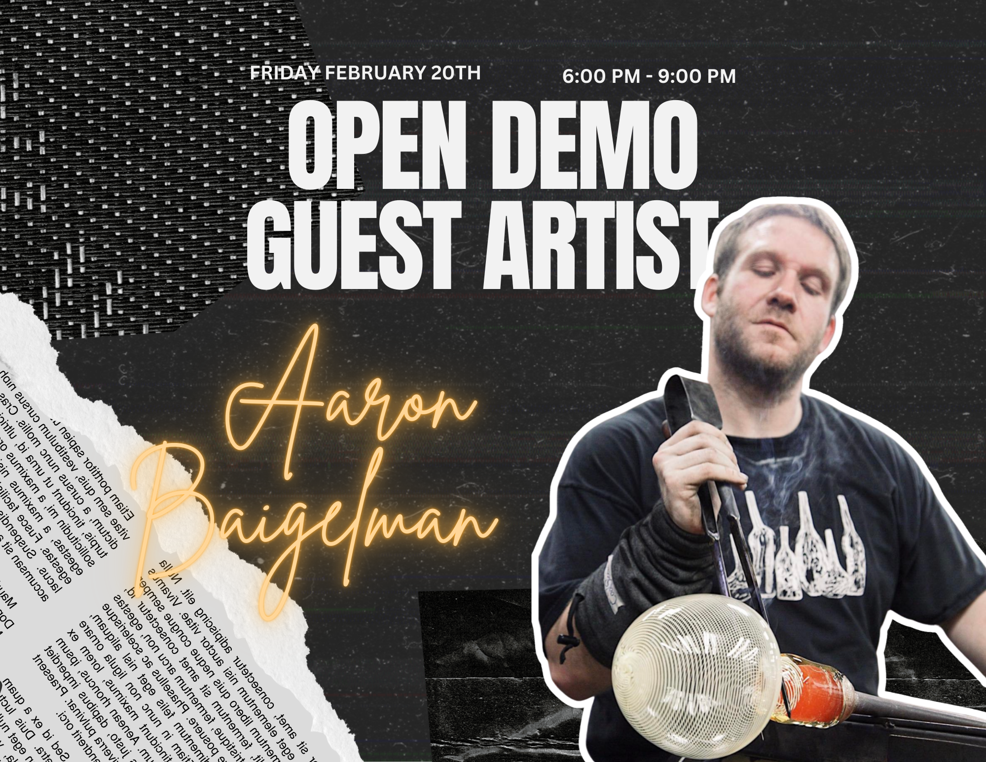 February’s Open Demo Event is excited to feature artist, Aaron Baigelman! Baigelman is a glassblowing artist based out of Lake Forest, Illinois. He began working with glass at the age of eleven at Bucks Rock Camp in New Milford, Connecticut—an experience that sparked a lifelong dedication to the material. Since then, glass has remained both his medium and language, offering endless opportunities for exploration, problem-solving, and growth. Baigleman has studied at leading glass institutions including Pilchuck Glass School, Penland School of Craft, and the Corning Museum of Glass, and has completed a three-year residency at The EnergyXchange in North Carolina.